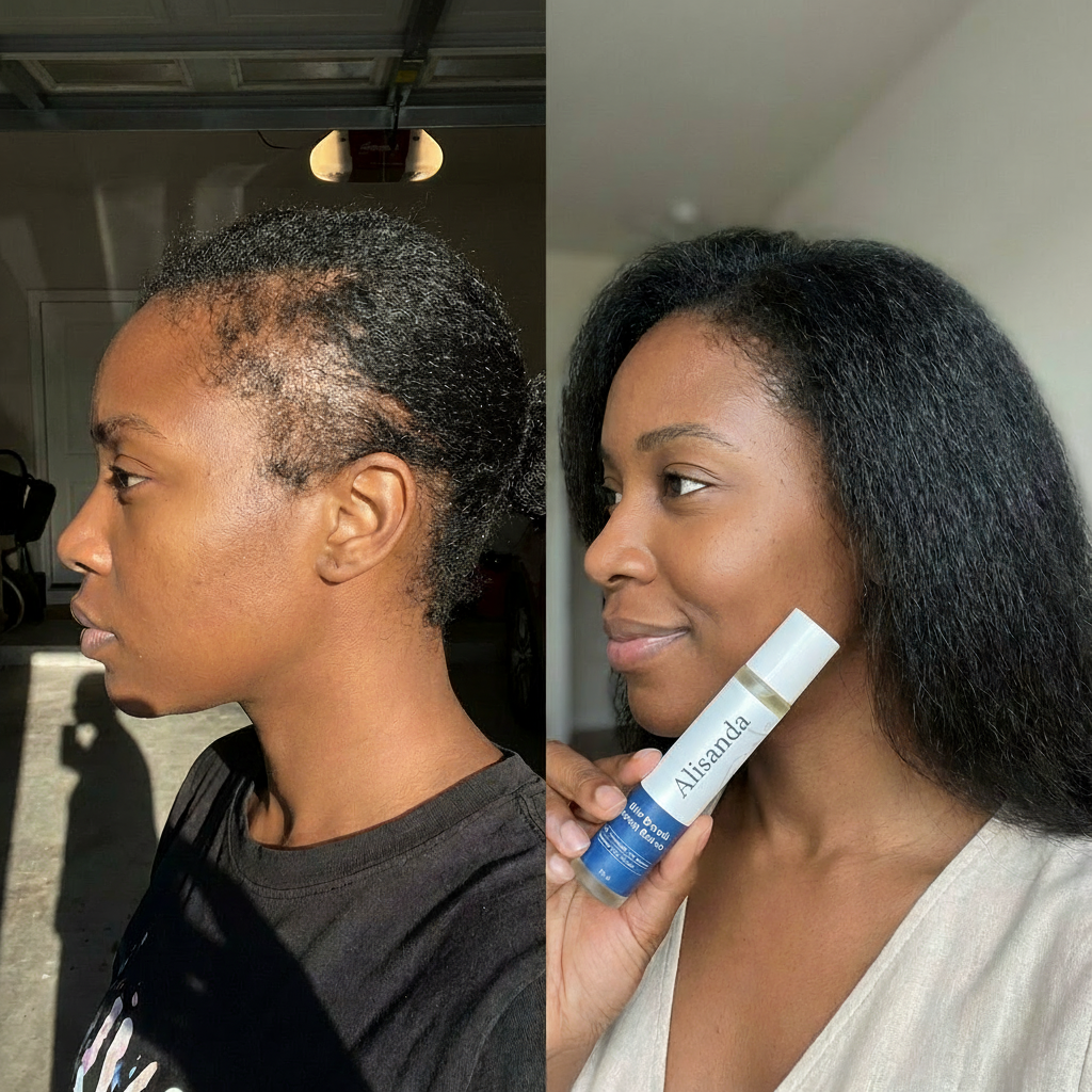 Postpartum hair loss hit mehard. My temples were practically bald, and I felt so ugly. I started using this roller with the serum inside and within weeks — actual regrowth. Baby hairs. Texture coming back. This product gave me hope.