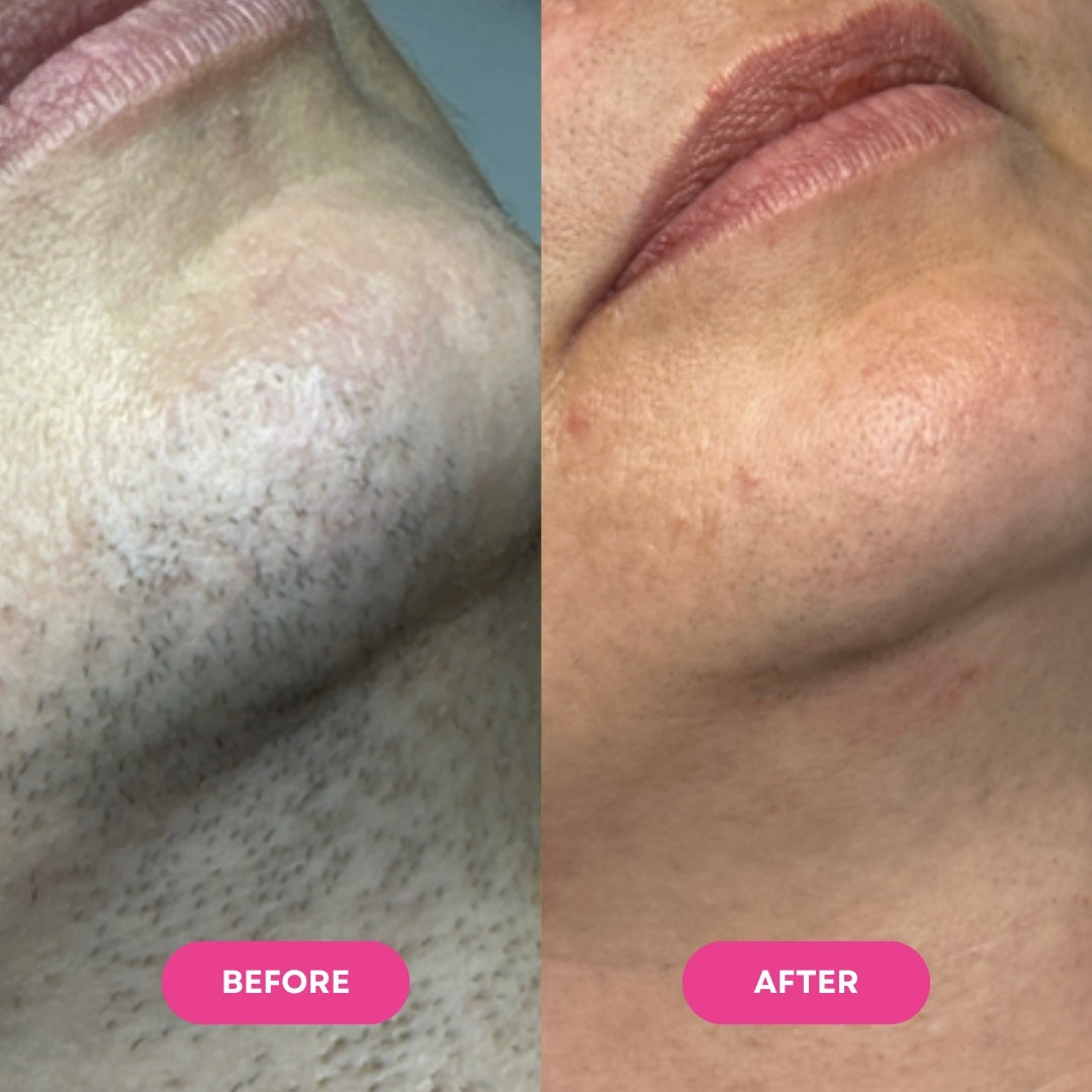 "Razor burn and ingrown hairs destroyed my chin. I plucked daily and hid under makeup. One month with this serum, hair barely visible now, skin healed, confidence is back. Thank you!!"
