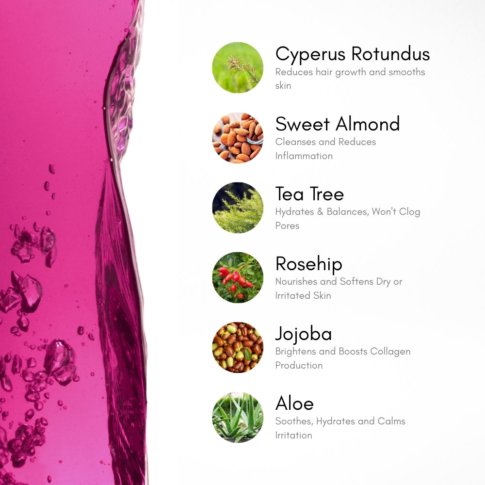 Tea Tree Oil prevents ingrown hairs. Jojoba Oil deeply hydrates without clogging pores. Sweet Almond Oil softens skin. Rosehip Oil brightens tone and fades dark spots. Aloe Extract cools inflamed follicles, delivering immediate relief while promoting smooth results.
